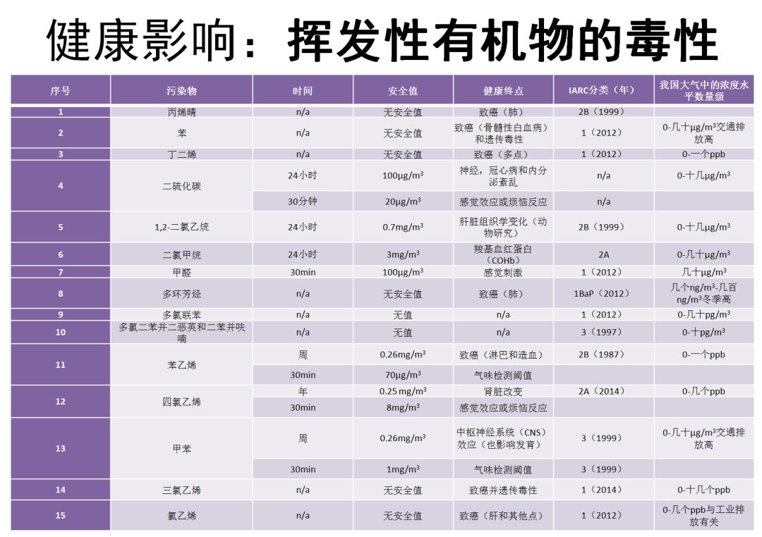 VOCs前沿(vocs99)在此普及一下:VOCs是指挥发性强、有刺激性、有毒的有机气体,包括氯乙烯、苯、多环芳烃等致癌物质,也是PM2.5的重要来源之一,对大气环境的危害极大。美国“清洁空气法”列出的189种有毒有害大气污染物中绝大部分都是VOCs。这些有毒有害VOCs通过呼吸道、皮肤等进入人体,导致各种急慢性健康问题,包括粘膜刺激、炎症、心肺疾病、癌症等。(附图:部分物质毒性)